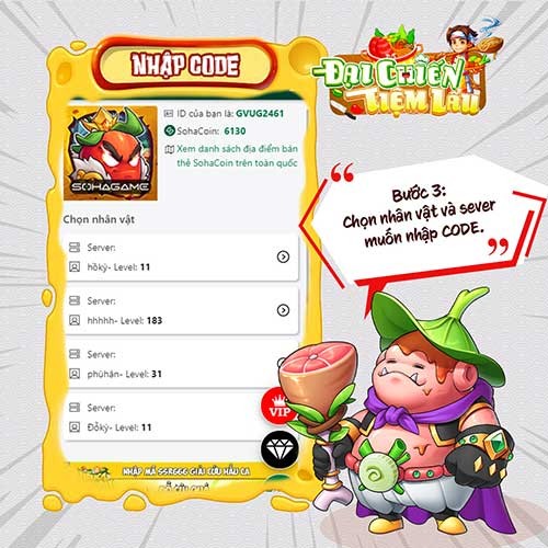 Bước 3: Tiếp theo, bạn cần chọn server và nhân vật mà bạn đang sử dụng trong game Đại Chiến Tiệm Lẩu.