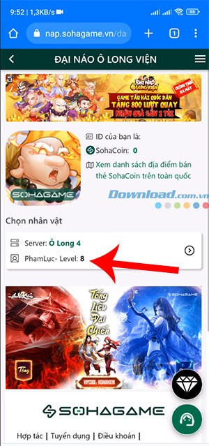Bước 3: Tiến hành chọn server và nhân vật mà bạn đang sử dụng trong game Đại Náo Ô Long Viện.