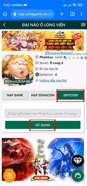 Hướng dẫn Đổi Code Game Đại Náo Ô Long Viện
