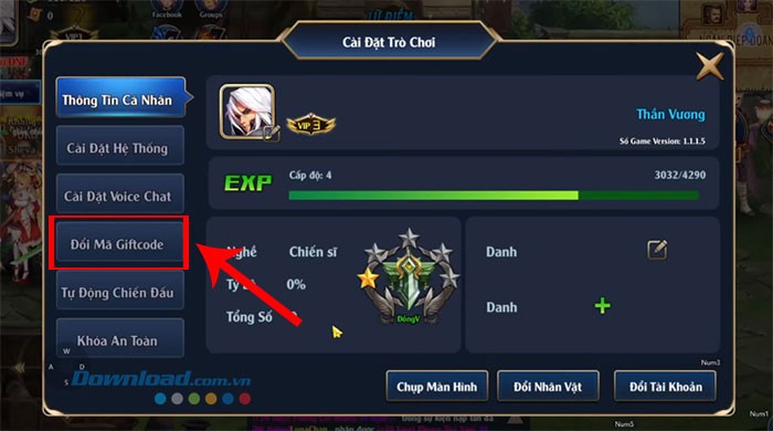 Bước 2: Chọn tab Đổi Giftcode từ giao diện hiện ra.