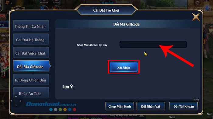Bước 3: Điền chính xác mã code, hoặc sử dụng chức năng sao chép và dán để nhập vào ô tương ứng. Cuối cùng, nhấn vào nút Xác nhận để kích hoạt mã và nhận thưởng trực tiếp trong game.