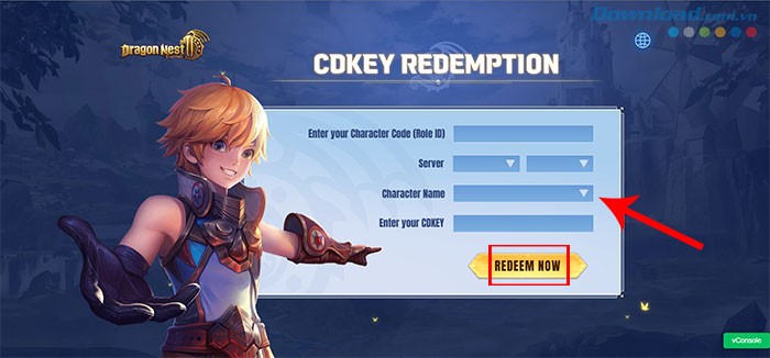 Bước 4: Truy cập trang web đổi code Dragon Nest 2: Evolution. Tại đây, bạn cần cung cấp một số thông tin cần thiết, bao gồm: Role ID (đã được sao chép ở bước trước), Server, và Character Name (tên nhân vật của bạn trong game).