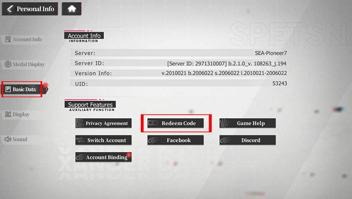 Sau đó, chọn Basic Data từ menu hiển thị, và tiếp tục chọn Redeem Code.