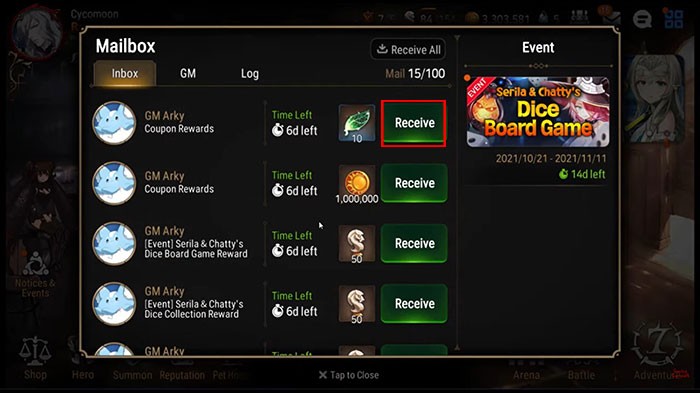 Bước 5: Để nhận phần thưởng, bạn cần quay lại giao diện chính của trò chơi. Chọn biểu tượng thư và nhấn nút Receive.
