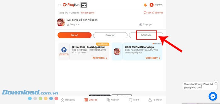Bước 2: Chọn tab Đổi Code. Sau đó, cung cấp các thông tin cần thiết như server, nhân vật và sự kiện tương ứng.