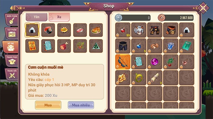 Cửa hàng cung cấp đa dạng các loại đồ ăn, có thể mua bằng đồng Yên hoặc đồng Xu. Đồ ăn cao cấp hơn sẽ mang lại hiệu suất hồi phục lớn hơn. Tuy nhiên, nhân vật cần đạt cấp độ yêu cầu của từng món ăn mới có thể sử dụng.