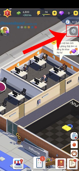 Bước 1: Khởi động ứng dụng Idle Office Tycoon trên thiết bị của bạn. Sau đó, hãy nhấn chọn vào biểu tượng bánh răng cài đặt, thường được đặt ở phía bên phải màn hình chính.