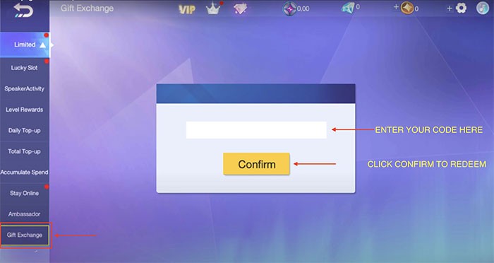 Bước 2: Chọn tab Gift Exchange để hiển thị giao diện nhập mã. Tiếp theo, hãy nhập chính xác hoặc sao chép mã code được cung cấp bên dưới vào ô dành riêng. Cuối cùng, nhấn vào nút Confirm để xác nhận.