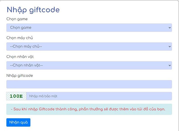 Bước 3: Điền chính xác hoặc sao chép mã code đã được cung cấp vào ô có chú thích Nhập Giftcode, sau đó nhấn vào nút Nhận quà để hoàn tất.