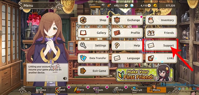 Bước 2: Tại màn hình chính của trò chơi, hãy tìm và chọn nút Support.