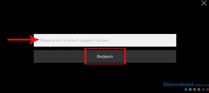 Bước 4: Tiến hành nhập chính xác hoặc sao chép mã code đã được cung cấp vào ô có nội dung Please enter a correct coupon number. Sau khi nhập, nhấn vào nút Redeem để hoàn tất quá trình đổi mã và nhận phần thưởng.