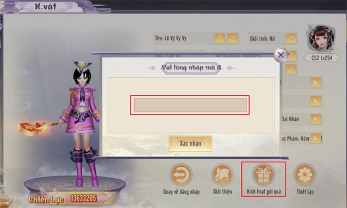 Bước 2: Trong giao diện menu Nhân vật, hãy lựa chọn mục Kích hoạt gói quà.