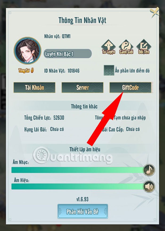 Bước 2: Trong menu Thông tin nhân vật, tìm và nhấn vào nút GiftCode.
