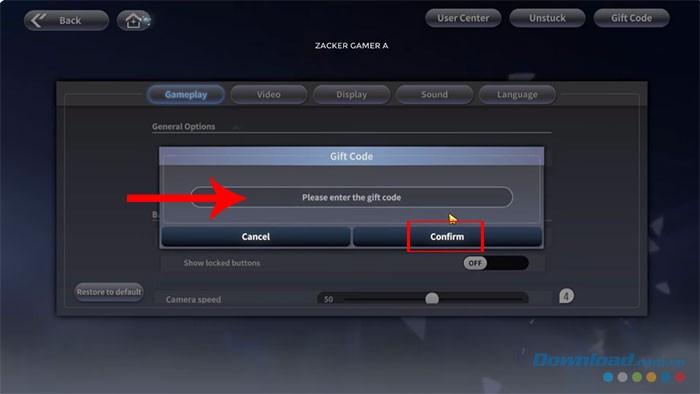 Giai đoạn 4: Điền chính xác hoặc sao chép mã code đã được cung cấp vào ô có chú thích Please enter the gift code. Cuối cùng, nhấn nút Confirm để hoàn tất quá trình nhập code và nhận phần thưởng trong game.