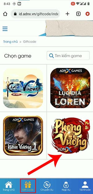 Bước 2: Chọn và nhấn vào mục Giftcode, sau đó lựa chọn tựa game Phong Vương ADNX Mobile từ danh sách hiển thị.