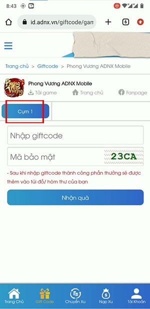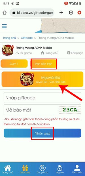 Hướng dẫn Đổi Mã Code Game Phong Vương ADNX Mobile