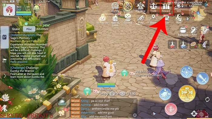 Giai đoạn 1: Khởi động ứng dụng Ragnarok Origin trên thiết bị của bạn. Sau đó, hãy tìm và chọn mục Reward, thường được hiển thị ở cạnh phải màn hình giao diện chính.
