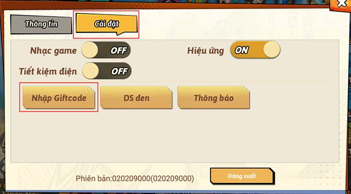 Bước 2: Trong giao diện mới, chọn tab Cài đặt. Tiếp theo, lựa chọn mục Nhập Giftcode để tiến hành nhập mã.
