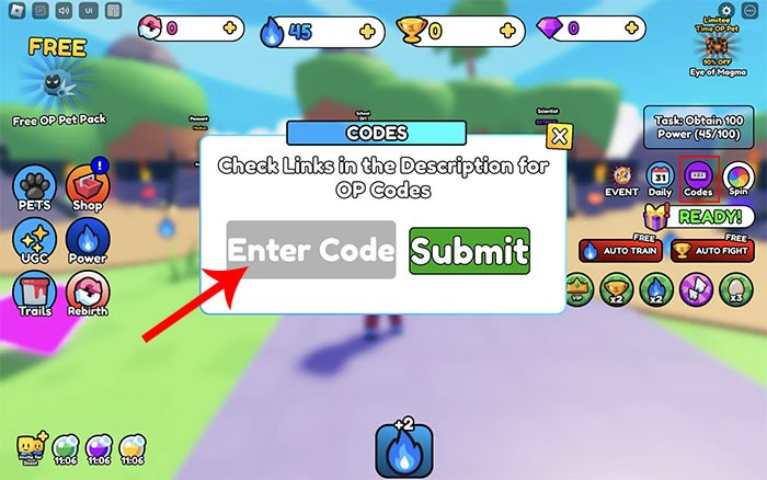 Bước 2: Trong cửa sổ Codes hiện ra, hãy nhập chính xác mã code đã được cung cấp hoặc sao chép và dán vào ô Enter code. Sau khi hoàn tất, nhấn vào nút Submit để kích hoạt mã và nhận phần thưởng tương ứng.