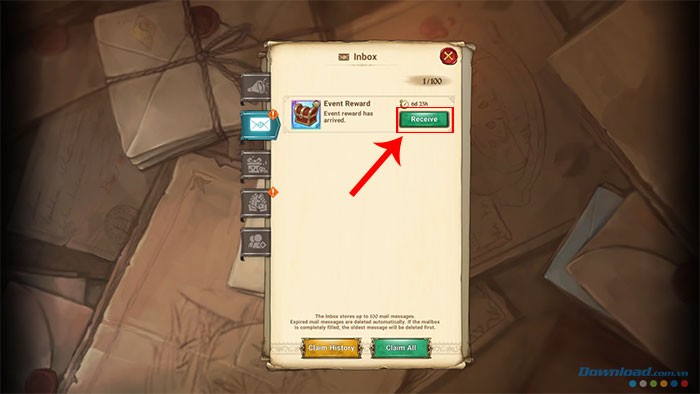 Bước 5: Chạm vào tab biểu tượng phong bì thư, sau đó nhấn nút Nhận hoặc Thu thập tất cả để nhận phần thưởng.