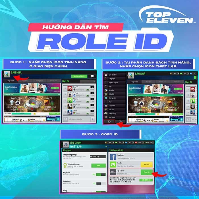 Để bắt đầu quá trình đổi code, bạn cần thực hiện Bước 1: Mở ứng dụng Top Eleven VNG trên thiết bị đang sử dụng và truy cập vào mục Cài Đặt. Tại đây, hãy sao chép mã ID Huấn luyện viên của bạn.