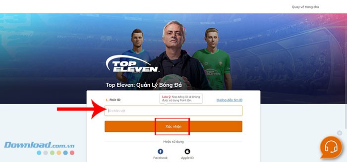 Tiếp theo, thực hiện Bước 2: Truy cập trang web https://pay.zing.vn/game/top11 . Sau đó, dán mã ID Huấn luyện viên vừa sao chép vào ô có tên Role ID và nhấn vào nút Xác nhận.