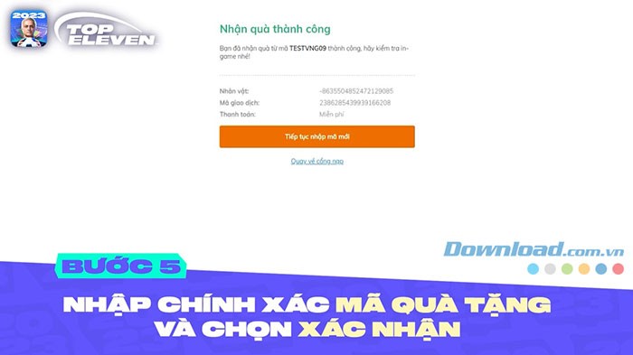 Bước 5: Nếu quá trình nhập mã diễn ra thành công, bạn sẽ nhận được thông báo Nhận quà thành công. Hãy mở lại ứng dụng Top Eleven VNG để kiểm tra. Quà tặng sẽ được tự động cộng vào tài khoản game của bạn.