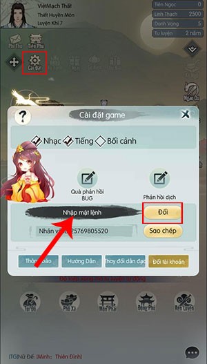 Bước 2: Một cửa sổ Cài đặt game sẽ hiện ra. Tại đây, bạn cần nhập chính xác mã code đã được cung cấp, hoặc có thể sao chép và dán trực tiếp vào ô có tên Nhập mật lệnh.