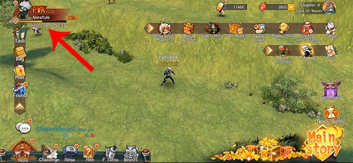 Bước 1: Khởi động Ultimate Hokage Duel trên thiết bị của bạn. Sau đó, hãy chọn vào biểu tượng nhân vật, được đặt ở góc trên cùng bên trái màn hình.