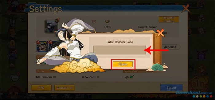 Bước 3: Điền chính xác hoặc sao chép các mã code đã được cung cấp vào ô tương ứng. Cuối cùng, nhấn nút Claim để xác nhận việc sử dụng mã và nhận phần thưởng trực tiếp trong trò chơi.