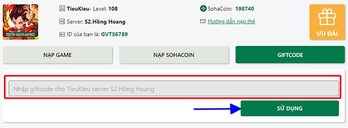 Bước 4: Chuyển đến tab Giftcode, sau đó nhập chính xác mã code đã được cung cấp hoặc sao chép và dán vào ô dành riêng. Cuối cùng, nhấn vào nút Sử dụng để kích hoạt.