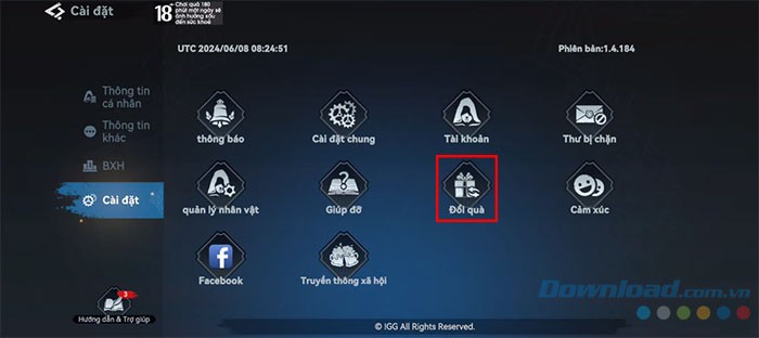 Sau khi vào phần cài đặt, hãy chọn mục Đổi quà.
