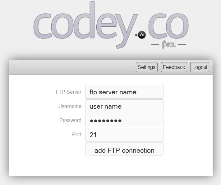 Để bắt đầu sử dụng Codey, bạn chỉ cần tiến hành đăng ký một tài khoản. Sau đó, hãy đăng nhập vào hệ thống bằng các thông tin quản trị cần thiết, bao gồm tên FTP server, username và password tương ứng.