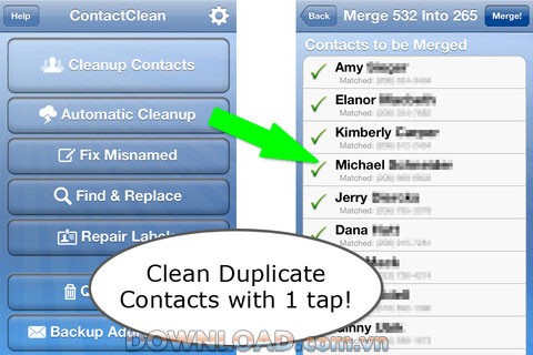 Quá trình làm sạch tự động sẽ nhanh chóng xác định các contact trùng lặp dựa trên tên, số điện thoại và địa chỉ email. Ứng dụng sẽ tự động kết hợp chúng lại với nhau.