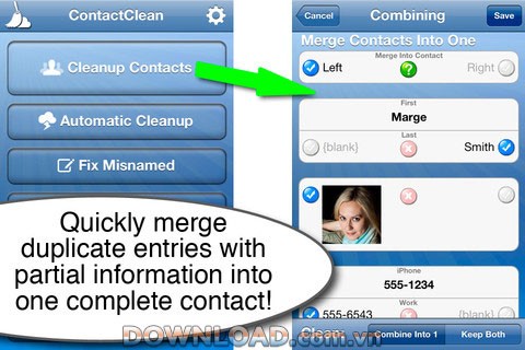 ContactClean Pro cho phép người dùng dễ dàng hợp nhất các thành phần thông tin khác nhau của cùng một đối tượng vào một contact duy nhất, đầy đủ.