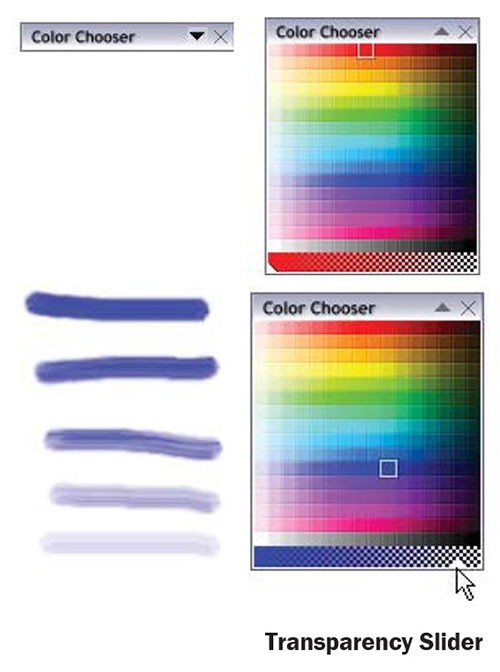 Color Chooser: Công cụ này có thể được tìm thấy ở góc trên bên phải của thanh công cụ. Nhấp vào mũi tên xuống để mở Color Chooser và lựa chọn màu sắc phù hợp. Người dùng cũng có thể điều chỉnh độ trong suốt hoặc màu sắc bằng cách sử dụng thanh trượt ở cuối (Transparency Slider).
