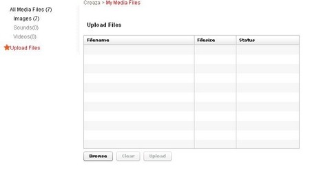 Sau khi đăng ký thành công, Creaza sẽ tạo một trang cá nhân dành riêng cho bạn, nơi lưu trữ tất cả các dự án của bạn tại địa chỉ http://creaza.com/members/Register . Để thuận tiện cho việc sử dụng, bạn nên xây dựng một thư viện chứa hình ảnh, âm thanh và video. Hãy chuyển đến thẻ My media files, chọn Upload files, sau đó click vào Browse để chọn các tập tin cần thiết và nhấn Upload.