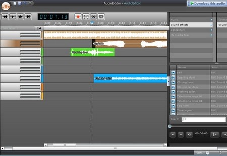 Giao diện của AudioEditor hiển thị 8 kênh âm thanh. Bạn có thể kéo và thả các âm thanh từ cột bên phải màn hình vào các kênh này để tạo ra bản nhạc yêu thích. Chương trình cung cấp 4 nhóm thể loại: Music (nhạc), Sound effects (hiệu ứng âm thanh), Contentum (âm thanh thông thường) và My media files (âm thanh từ thư viện cá nhân). Sau khi hoàn thành, hãy click vào nút Play để nghe lại thành quả của mình.