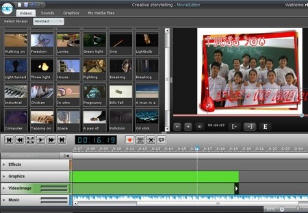 Với MovieEditor, bạn có thể nhanh chóng chỉnh sửa những đoạn phim tự làm một cách ấn tượng với các thao tác đơn giản. Thanh công cụ bao gồm các thẻ: Videos (phim), Sounds (âm thanh), Graphics (hình ảnh) và My media files (lấy video, nhạc, hình từ thư viện cá nhân). Chọn các đối tượng từ các thẻ này, kéo xuống khung biên tập và sắp xếp theo ý tưởng của bạn.