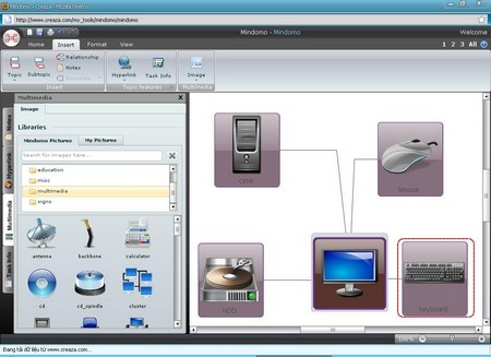 Click vào thẻ Multimedia bên trái màn hình để thêm hình ảnh minh họa trực quan cho sơ đồ của bạn. Với 4 ứng dụng web hữu ích của Creaza, bạn sẽ có thể thỏa sức sáng tạo và chia sẻ ý tưởng của mình với bạn bè.