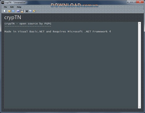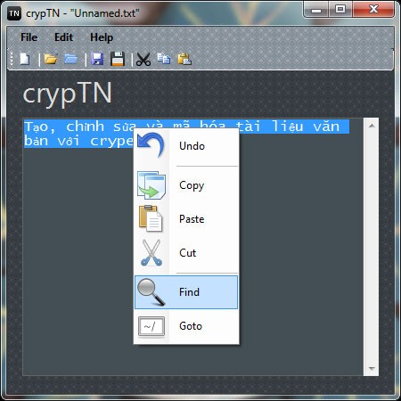 Giao diện của crypTN được thiết kế đơn giản, với các thanh menu và công cụ chức năng được sắp xếp khoa học. Phía dưới là vùng văn bản, nơi bạn có thể nhập hoặc hiển thị nội dung. Trong quá trình soạn thảo, bạn có thể sử dụng trình đơn chuột phải để thực hiện các thao tác như: (hoàn tác), (tìm kiếm), (di chuyển đến dòng) và các lệnh cơ bản khác. Ngoài ra, menu "Edit" cũng cung cấp các lệnh tương tự.