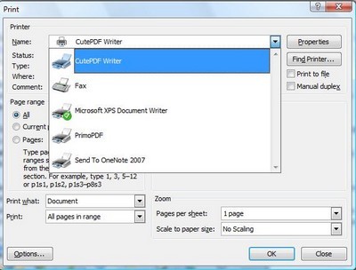 - Trong hộp thoại in, chọn CutePDF Writer làm máy in và nhấn Print (không chọn Print to File).