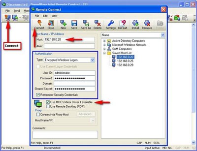 Khi khởi động DWMRC, cửa sổ chính của chương trình và hộp thoại Remote Connect sẽ xuất hiện. Hộp thoại Remote Connect được sử dụng để thêm, chỉnh sửa các kết nối đã lưu trong Saved Host List. Để tạo một kết nối mới, thực hiện các bước sau: