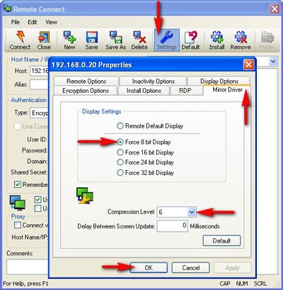 - Khi điều khiển qua Internet hoặc quay số qua modem, nên chọn mức thấp nhất của Display là Force 8 bit và Compression Level là 6.