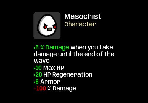 Masochism đòi hỏi xây dựng một Brotato bền bỉ để có thể chiến đấu sau khi chịu sát thương.