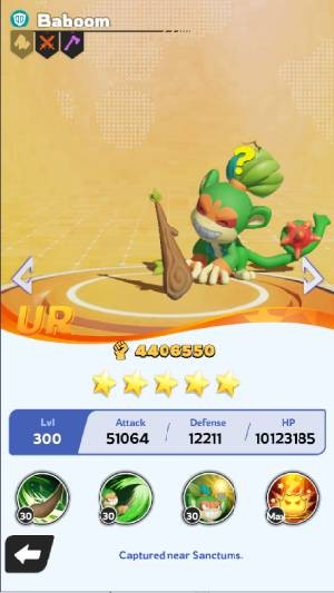 Baboom là Palmon nguyên tố Đất, đạt độ hiếm 5 sao và được định vị là một đơn vị Tấn công (Attack).