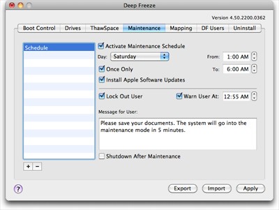 - Tính tùy biến cao: người quản lý có thể dễ dàng cài đặt các chế độ và lịch bảo dưỡng theo lịch hoặc không định kỳ. Chương trình tương thích với chức năng Apple Remote Desktop.
