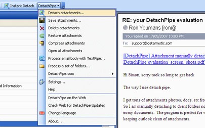 Với DetachPipe, bạn có toàn quyền kiểm soát các tập tin đính kèm: lưu, xóa, nén hoặc tái đính kèm. Bạn thậm chí có thể thiết lập DetachPipe để tự động tách hoặc xóa các file đính kèm khi nhận hoặc gửi email.