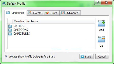 Ngay sau khi khởi động Disk Pulse, hộp thoại Default Profile sẽ hiển thị, cho phép bạn lựa chọn các thư mục cần giám sát. Hãy sử dụng nút Add để thêm thư mục vào danh sách Monitor Directories, hoặc nút Del để loại bỏ thư mục không cần thiết.