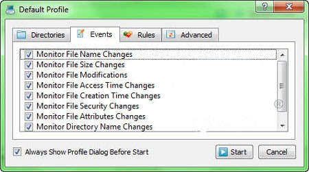 Chương trình mặc định theo dõi mọi thay đổi trong thư mục đã chọn. Tuy nhiên, bạn có thể thu hẹp phạm vi này để tăng tốc độ xử lý. Chuyển sang tab Events và chọn các loại thay đổi bạn muốn theo dõi: Monitor File Name Changes (thông báo khi tên file thay đổi), Monitor File Size Changes (thông báo khi kích thước file thay đổi), Monitor File Attributes Changes (thông báo khi thuộc tính file thay đổi),… Để đảm bảo việc giám sát toàn diện, nên giữ nguyên các tùy chọn mặc định. Cuối cùng, nhấn nút Start để bắt đầu quá trình theo dõi.